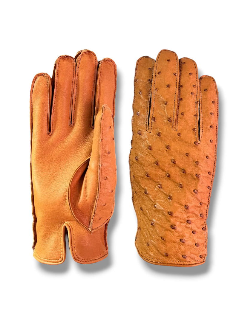 Guanti da uomo in vera pelle metis e dorso struzzo foderati in cashmere.