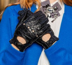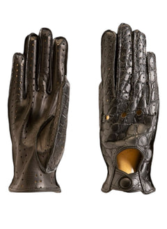 Guanti da donna da guida in vera pelle metis e dorso Coccodrillo con bottone rivestito in pelle.