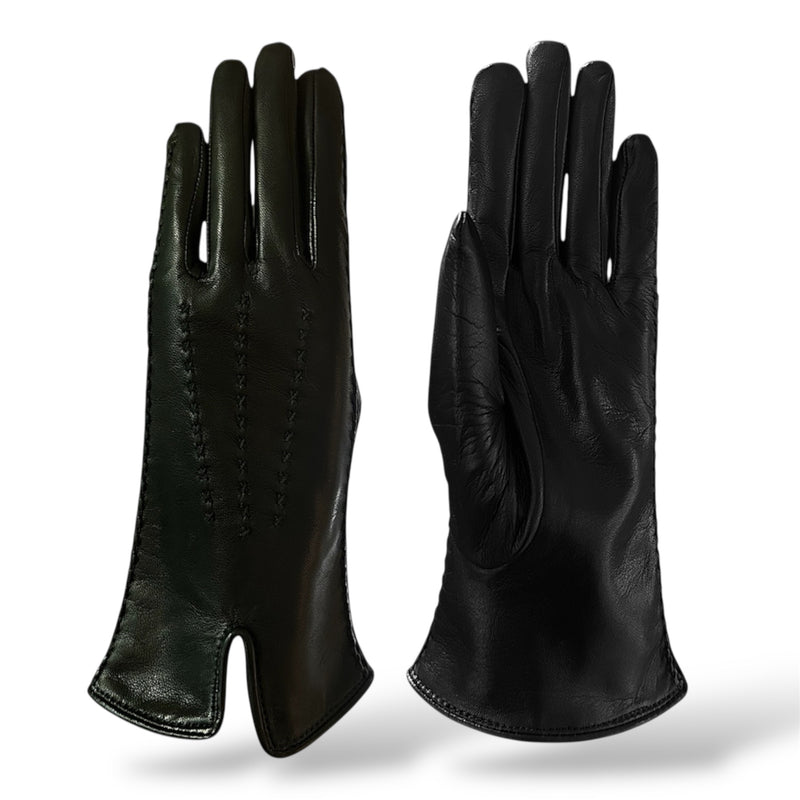Guanti da donna trendy in vera pelle metis con baguette laterale e fodera in seta